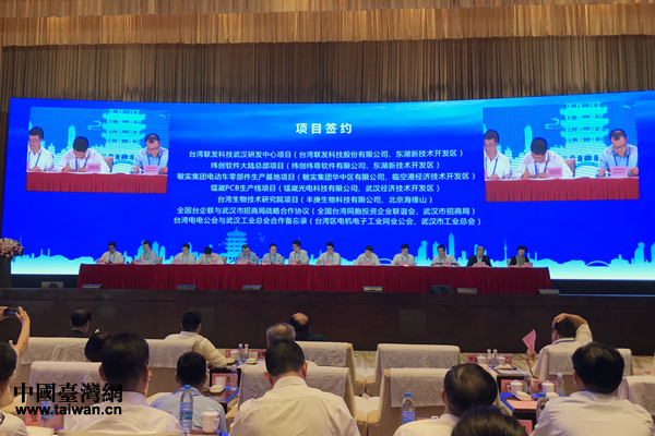 論壇現場,臺灣聯發科技武漢研發中心項目、緯創軟件大陸總部項目、敏實集團電動車零部件生產基地項目、鐳崴PCB生產線項目、臺灣生物技術研究院項目等7項合作成功簽約。