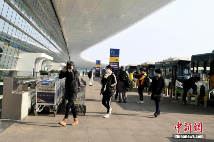 23日,首批約200名滯留武漢的臺胞乘坐上海航空公司的民航包機返臺。圖為臺胞抵達武漢天河國際機場準備乘機。