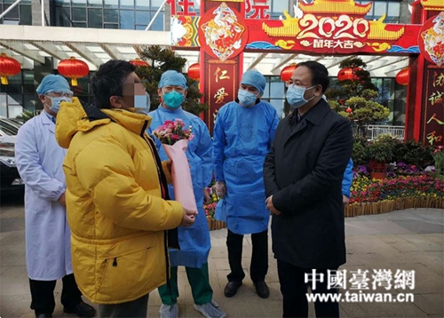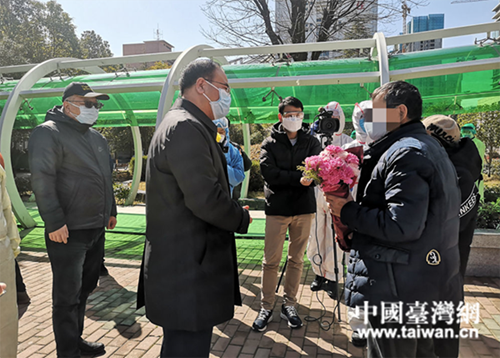 圖為湖北省臺辦主任李建紅(右一)在武漢協和醫院迎接痊愈出院的臺胞金先生(黃衣者)。(來源:湖北省臺辦)