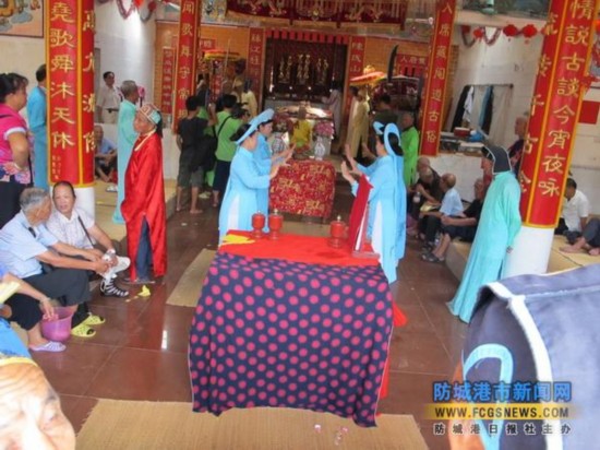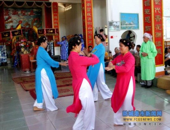 哈節(jié)除了歌舞娛樂外,還依順序舉行“迎神”、“祭神”、“送神”等儀式。“迎神”的人們打著羅傘,抬著神案,于鼓樂聲中到大海邊把“鎮(zhèn)海大王”等靈神迎接回哈亭正殿就座,然后由德高望重的人主持,率眾人以“三牲五禮”敬獻(xiàn)于諸神及歷代先祖面前,祈求他們保護(hù)全村平安,各戶興旺。直到哈節(jié)結(jié)束,才再次打傘抬案,一路香燭相伴,把諸神送歸天界。京族人的宗教觀念大都與海有關(guān),寄托著他們對(duì)大海的敬畏及追求。(盧欣)