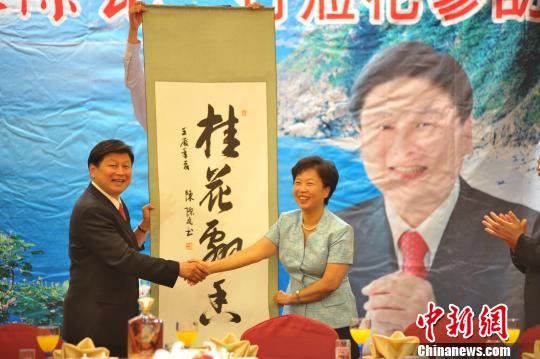 傅崐萁代表臺灣向廣西贈送“桂花永譽”字樣七彩石禮物,翼兩地友誼長存。 孫潔 攝