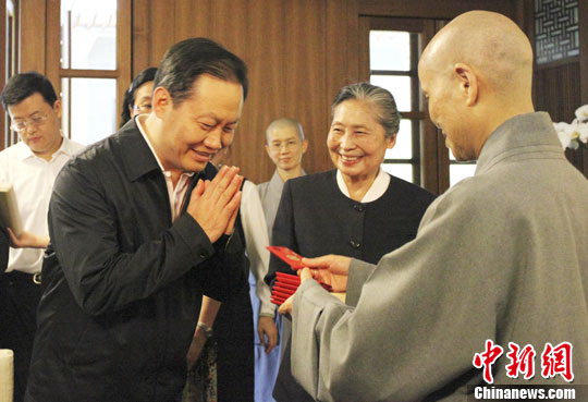 4月24日,佛教高僧證嚴法師在臺灣花蓮會見訪臺的中共廣西壯族自治區委員會書記彭清華一行。圖為證嚴法師向彭清華贈送福慧紅包。中新社發 周群 攝