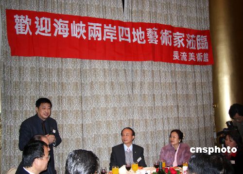 1月11日,由中國油畫家學(xué)會、海峽兩岸創(chuàng)作研究基地主辦,臺灣長流美術(shù)館、廈門中華兒女美術(shù)館承辦的“海峽兩岸四地畫家畫兩岸——奇巧縱橫寫生交流活動”將在花蓮展開。圖為10日晚,臺灣長流美術(shù)館在臺北圓山飯店宴請前來參加活動的兩岸及港澳30多名畫家,(中)為臺灣長流美術(shù)館館長黃承志,(左一)致辭者為中國油畫家學(xué)會副會長張祖英。 中新社發(fā) 陳立宇 攝