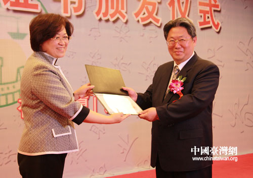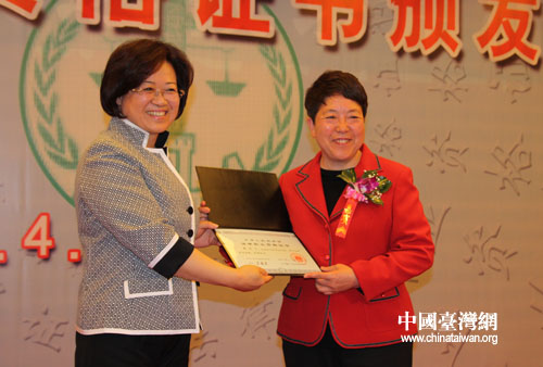 國家司法考試司司長丁露為獲得律師職業(yè)資格的臺灣居民頒發(fā)資格證書。(中國臺灣網(wǎng) 張弛 攝)
