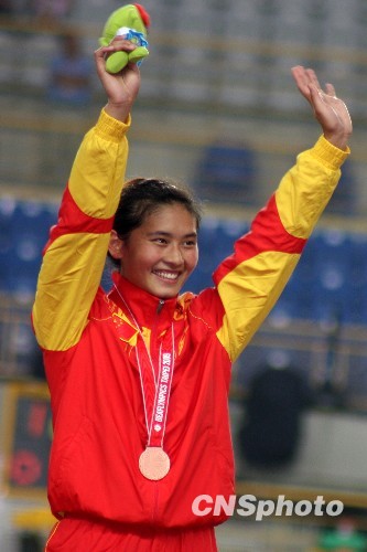 9月8日,臺北聽障奧運會賽事第3日,中國聽奧代表團進賬首金,江蘇女將高李芳以輕傷為代價勇奪一銅。圖為當晚,高李芳在領獎臺上揮手向觀眾致意,展現(xiàn)燦爛笑容。 中新社發(fā) 董會峰 攝
