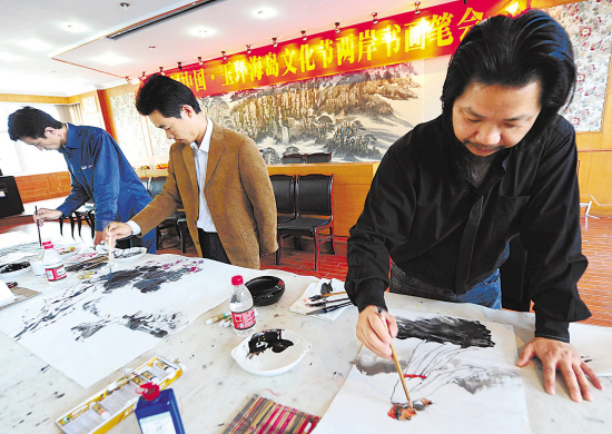圖為海峽兩岸書畫家現(xiàn)場潑墨揮毫。