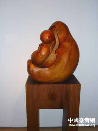 開幕式上,康木祥為來賓介紹了用紅檜、梢楠、牛樟等木材雕刻而成的“圣嬰”、“向上”、“深情”、“母子”、“良緣”等作品。這些作品雖形態各異,但有一個共同特點,就是充分利用樹木的形狀、裂縫、紋理,盡情展示生命的最初形態和原始美感。在介紹到作品“包容”時,康木祥說,這是他迄今為止難度系數最大的一件作品,在創作過程中,手被敲傷、割破多次。說這番話時,他的臉上露出淡然的微笑。