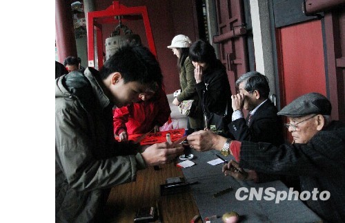 虎年春節,前來臺北孔廟祭拜孔子的年輕人絡繹不絕。圖為書法家為前來膜拜進香的學生題寫祈福的墨寶,以期學業長進。 中新社發 閆曉虹 攝
