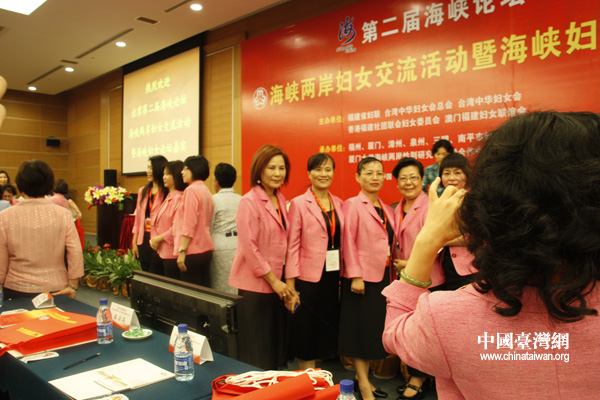 兩岸婦女代表們在大會背景板前選取各種角度合影留念。(中國臺灣網 李桂英 攝)