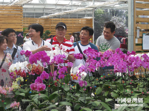 臺灣青年創(chuàng)業(yè)協(xié)會十杰基金會訪問團(tuán)一行高興地談?wù)撨@是“胡總書記今年參觀過的蘭花品種”。(漳浦縣臺辦 陳文亮 攝)