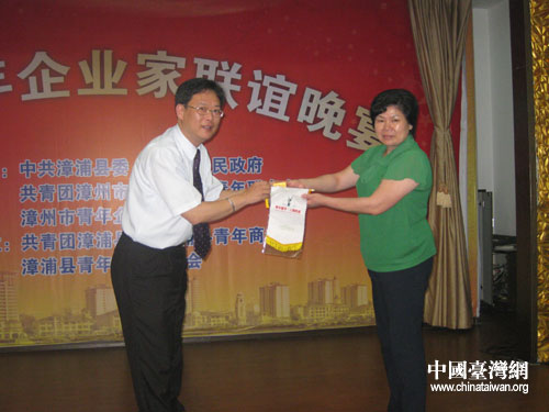 臺灣青年創(chuàng)業(yè)協(xié)會十杰基金會向漳浦縣副縣長王彩云(右)贈送“青年動手 人類希望”的圖標(biāo)。(漳浦縣臺辦 陳文亮 攝)