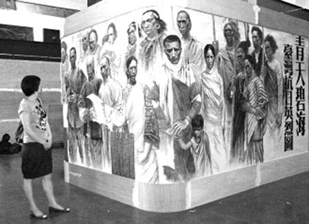 由50位大陸畫家花了5年半時間集體創作的一幅畫卷7月7日在臺北“國父紀念館”開幕,吸引了各界人士前去參觀。這幅長達800米的史詩國畫按真人比例繪出了1000多位抗戰歷史人物,其中包括210位殉職的國民黨將領,以及羅福星、蔣渭水、丘逢甲、莫那魯道等島內的抗日英雄。
