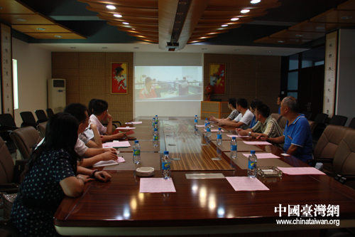 鵬程實業有限公司管理人員陪同臺企轉型升級服務團及專家觀看企業宣傳片。(中國臺灣網 胡珊珊 攝)