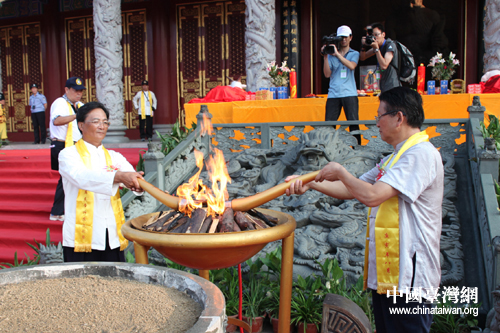 炎帝陵基金會常務副理事長鄧德芳與臺灣“中華神農大帝協進會”理事長陳福財共同點燃炎帝圣火(中國臺灣網 趙輝 攝)