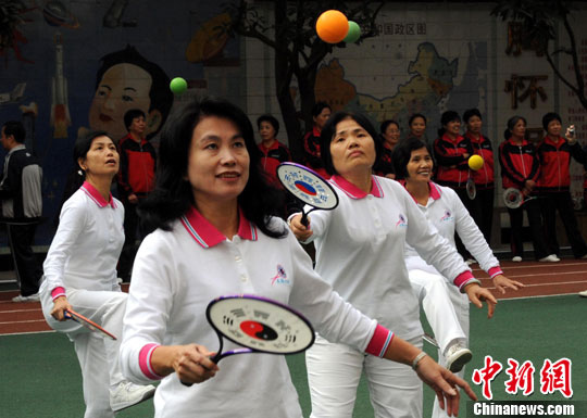 12月4日,海峽兩岸柔力球、健身氣功交流活動在福州群眾路小學舉行。圖為參加該交流活動的86名臺灣柔力球愛好者做精彩表演。中新社記者 劉可耕 攝