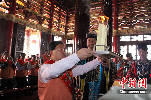 12月20日,位于泉州鬧市的元妙觀熱鬧非凡,由臺(tái)灣彰化市市長(zhǎng)邱建富率領(lǐng)的臺(tái)灣彰化元清觀朝圣團(tuán)前來(lái)祖庭進(jìn)香分靈。郭斌 攝