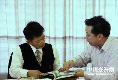浦東新區(qū)臺辦副主任范桂國向楊秋興介紹浦東情況。圖片來源:浦東新區(qū)臺辦