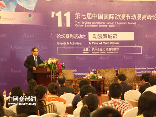 4月28日下午,第七屆中國(guó)國(guó)際動(dòng)漫節(jié)“動(dòng)漫雙城記”高峰論壇開(kāi)幕,臺(tái)灣尖端出版集團(tuán)執(zhí)行長(zhǎng)黃鎮(zhèn)隆發(fā)表以“讓城市充滿活力的動(dòng)漫”為主題的演講。(中國(guó)臺(tái)灣網(wǎng) 李丹 攝)