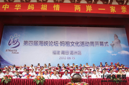 中國臺灣網6月15日莆田消息 以“中華馬祖情、兩岸一家親”為主題的第四屆海峽論壇·媽祖文化活動周于今日上午在湄洲島天后廣場舉行開幕式。本屆媽祖文化活動周以全國臺聯(lián)為指導單位,由莆田市人民政府、福建省臺辦、福建省臺聯(lián)共同主辦。莆田市政協(xié)主席林慶生主持了開幕式,莆田市長梁建勇致歡迎詞,中華媽祖文化交流協(xié)會副會長兼秘書長、湄洲媽祖祖廟董事長林金榜及臺灣媽祖宮廟代表蔡詠锝致辭。在開幕式上,全國臺聯(lián)主席梁國揚等四位嘉賓共同啟動“第四屆海峽論壇·媽祖文化活動周”開幕按鈕。