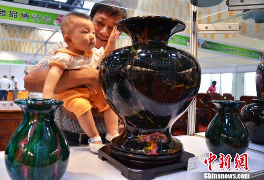 由新疆旅游局和克拉瑪依市人民政府主辦的首屆旅游商品博覽會(huì)10日在此間拉開序幕,圖為新疆民眾帶著孩子觀看臺(tái)灣名石七彩玉制作的器物。孫亭文 攝