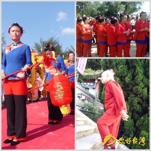 湄洲女服飾叫“媽祖裝”,海蘭色斜搭襟的中式上衣代表著大海的藍;相處,媽祖喜愛紅色褲子,下黑上紅的寬大褲子是由于媽祖常年在海上救助漁民,褲子被海水打濕后遠遠看去像黑色,而上半截沒有被海水打濕的部分還是紅色的,久而久之衍化為上紅下黑的款式,紅黑分別象征吉祥與思念。