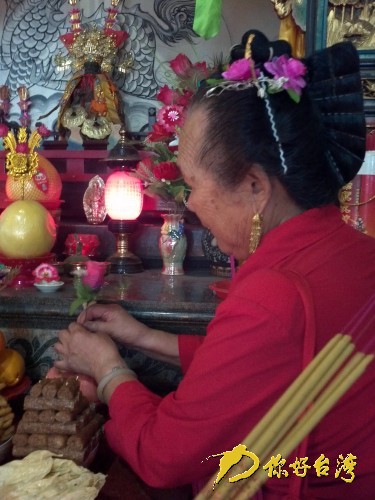 梳妝樓里的供品讓人印象深刻。幾個紅色的塑料盤里托著各式各樣的化妝品,種類繁多,有護膚品、有粉餅,還有頭飾。媽祖像前長期放置的一排供品也很有特色,香菇、餅、豆干等各種素食整齊地疊放,呈上小下大的寶塔狀,每個寶塔的頂端都插上一朵小紅花。或許,媽祖生前也愛紅花吧?