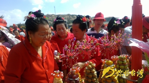 青浦底澳口海灘,島上14個村子的湄洲女趕來祭拜媽祖,供桌前,他們用心裝點著祭祀媽祖的供品,把他們打扮得如同自己的服飾——喜慶富貴、花枝招展……