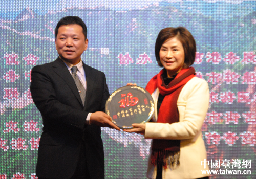 北京市臺(tái)聯(lián)副會(huì)長(zhǎng)潘新洋與高雄河邊餐飲集團(tuán)董事長(zhǎng)張素鑾互贈(zèng)禮品。(北京通訊員 郭寧 攝)