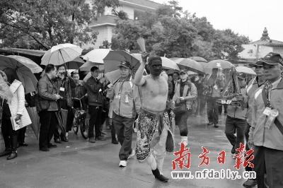 一路上,一位赤裸上身,腰圍彩巾的信眾扮演神靈附身的“三山國王”,只見他臉涂黑炭,手握燃香,跳著舞步,開路在先,引領拜謁隊列拾級而上(如上圖)。隊列最前一排的信眾則手捧從臺灣各地宮廟迎來的“三山國王”像,帶領信眾行三拜虔誠之禮,整個祭祀過程為時90分鐘。