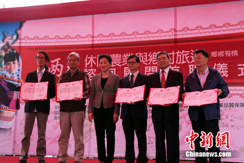4月1日,“兩岸鄉村休閑旅游嘉年華”在臺灣苗栗縣飛牛牧場開幕。活動由福建省旅游協會、臺灣鄉村旅游協會、臺灣休閑農業發展協會、臺灣旅行業品質保障協會聯合主辦。圖為福建方面聘任臺灣休閑農業發展協會顧問邱涌忠、臺灣休閑農業學會創會理事長陳昭郎、臺灣鄉村協會理事長鄭健雄等人為兩岸休閑農業與鄉村旅游咨詢顧問,希望專家學者能夠為福建鄉村旅游發展獻計獻策。(左3)為福建省旅游協會會長朱華。