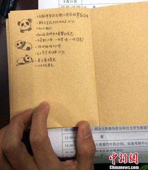 2月10日,臺大學生陳宇威在聽課記錄本上畫了許多大熊貓的各種動態。 張麗君 攝