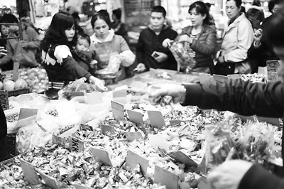 澳門:人們在澳門義字街的年貨市場購買食品(2月9日攝)。新華社記者 張金加攝