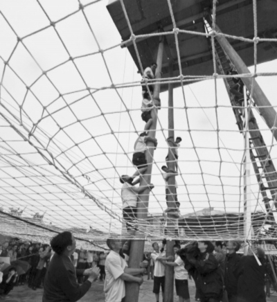 在搶孤活動中,參賽的勇士們以疊羅漢的方式,沿著孤棚柱奮力往上爬,奪取順風旗和獎品。
