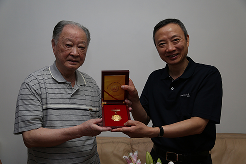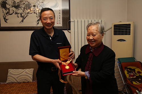 四川省臺辦主任周敏謙向彭宗萍同志發放中國人民抗日戰爭勝利70周年紀念章。