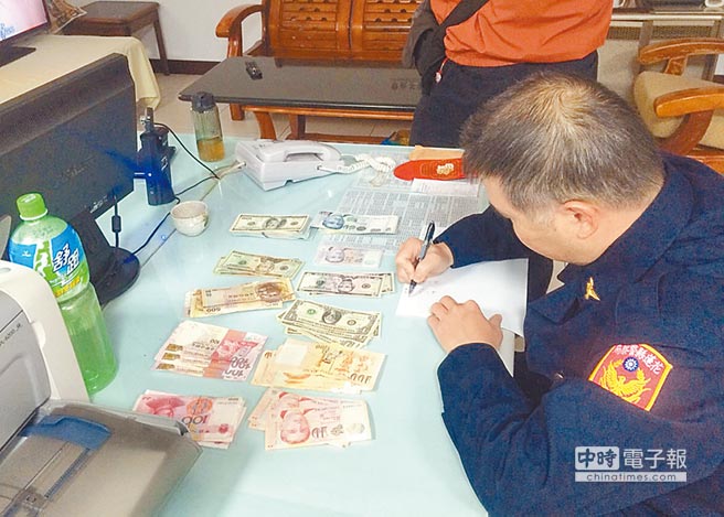新城警方一一清點良心司機拾獲的一袋外幣,發(fā)現(xiàn)幣值高達新臺幣17萬元,并通報警廣協(xié)尋失主。圖片來源:臺灣中時電子報