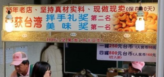 日月潭水社碼頭旁的杏仁酥?jǐn)傇O(shè)身處地為陸客著想,將攤位改成簡體字、售價(jià)也用人民幣標(biāo)示清楚,反而在這一波陸客減少潮中未受沖擊。(圖片來源:中評(píng)社)
