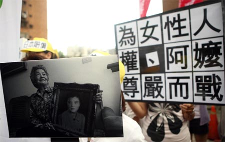 臺籍“慰安婦”始終盼望日方道歉。圖為2010年8月,臺北民眾舉著標語和“慰安婦”照片抗議日本政府拒不道歉。新華社