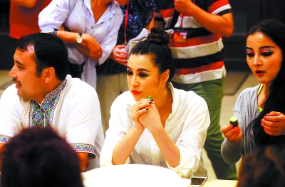 4月5日清晨5時(shí)多,古麗敏仁和十多位伙伴帶著家鄉(xiāng)人烤出的馕出發(fā)了。整整兩天,行程1萬(wàn)多公里,大家才終于抵達(dá)了演出第一站——臺(tái)灣臺(tái)中市。寶島的空氣真濕潤(rùn)啊,滿目綠意盎然。走出大漠走進(jìn)寶島的第一天,古麗敏仁就被迷住了?深櫜簧闲蕾p美景,古麗就和同伴們投入了緊張的排練。和田樂(lè)舞以其熱情奔放的魅力常常被安排為整場(chǎng)演出的壓軸。這意味著無(wú)論排練還是演出,姑娘們都要付出更長(zhǎng)時(shí)間的等待,但這可沒(méi)能讓古麗犯難。團(tuán)里為這次寶島之行準(zhǔn)備了4個(gè)精品節(jié)目,每個(gè)節(jié)目的服裝服飾截然不同。一次不到十分鐘的登臺(tái)表演最多需要長(zhǎng)達(dá)三個(gè)小時(shí)的化裝準(zhǔn)備。維吾爾姑娘獨(dú)特的化裝風(fēng)格和技巧甚至吸引了眾多同行來(lái)學(xué)習(xí)!八齻兊幕b更偏向戲劇感,棱角分明層次突出!眱(nèi)蒙古歌唱家格日樂(lè)圖雅連學(xué)三天,忍不住贊道。