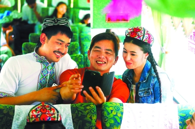 ▲ 在演出地點(diǎn)之間轉(zhuǎn)場(chǎng)動(dòng)輒幾個(gè)小時(shí),早出晚歸成了文化之旅團(tuán)員們的常態(tài),而大巴車則成了演員們臨時(shí)的“家”。一直跟隨著演出團(tuán)四處奔波的當(dāng)?shù)貙?dǎo)游跟著團(tuán)隊(duì)看了一場(chǎng)又一場(chǎng)表演,直言自己已經(jīng)是鐵桿粉絲,閑暇時(shí)間他還會(huì)把自己在觀眾席上錄下的演出視頻拿出來(lái)回放,請(qǐng)演員們一同欣賞回味。