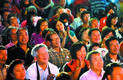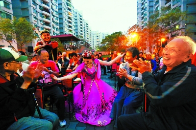 ▲ 臺(tái)南市長(zhǎng)榮里長(zhǎng)榮社區(qū)是現(xiàn)在臺(tái)南最大的眷村改造社區(qū),這里的2000余戶居民來(lái)自10個(gè)眷村,眾多臺(tái)灣大陸老兵居住在這里。為了迎接演出團(tuán),居民們提前三四個(gè)小時(shí)就聚集在社區(qū)的露天小舞臺(tái)前。為了讓這群特殊的觀眾了解新疆樂(lè)舞的魅力,古麗和同伴們走到觀眾席中間打起手鼓唱起歌,感染了眾多老人。