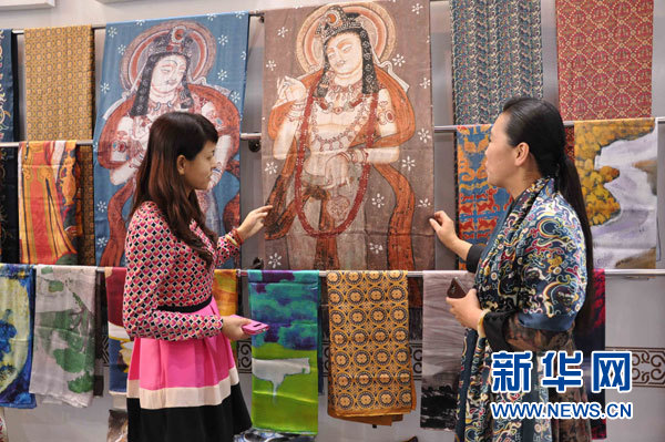 11月8日,在第八屆北京文博會新疆展館內,新疆八大畫廊藝術總監施蘇萍(右)在向參觀者介紹真絲藝術披肩。