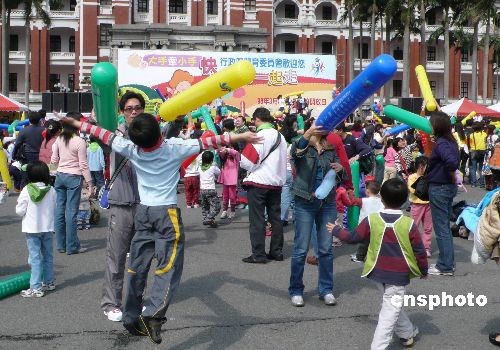 三月八日,連日陰雨的臺北市天空放晴,近千名小朋友和家長一起在臺北市一廣場參加親子運動會,享受陽光和玩耍的樂趣。中新社發(fā) 路梅 攝