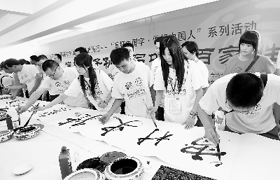 20日,在漳州青少年活動中心,前來參加第四屆兩岸青年聯歡節的漳臺兩地100名青少年書法愛好者共同參加“海峽兩岸炎黃子孫同寫中華百家姓” 活動。兩岸書法界的精英以書法藝術為媒,共同書寫中華百家姓。(記者 祝敏松 攝)