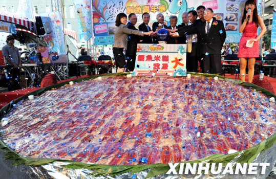當(dāng)天,為推廣促銷臺灣優(yōu)質(zhì)養(yǎng)殖水產(chǎn)品,“2009鰻魚嘉年華——鰻有意思”活動在臺北市舉行,現(xiàn)場展示了周長9.99米的大型鰻魚米糕,并開展各項(xiàng)魚產(chǎn)品試吃活動。新華社發(fā)(吳景騰 攝)