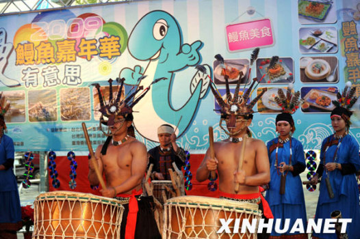 12月13日,臺灣原住民表演打擊樂,揭開臺北市“2009鰻魚嘉年華——鰻有意思”活動的序幕。