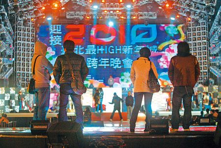 為迎接2010年,臺北市政府31日舉辦跨年晚會,工作人員30日晚間趕緊測試燈光及舞臺設備,演員也加緊排練。圖片來源:中國時報
