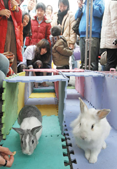 愛(ài)兔協(xié)會(huì)為推廣正確的兔子飼養(yǎng)知識(shí),特別舉辦這個(gè)運(yùn)動(dòng)會(huì),許多飼主在低溫細(xì)雨中帶著兔寶貝參賽,還有兔子穿著花俏短裙現(xiàn)場(chǎng)“比美”。