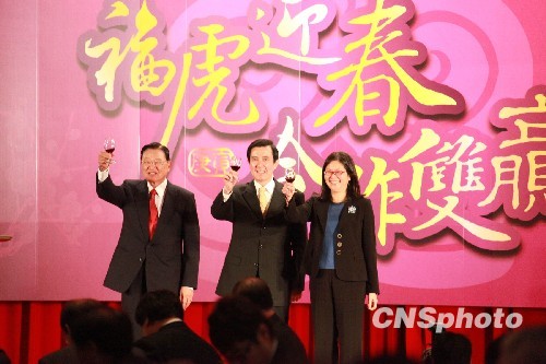 2月22日,“2010大陸臺商春節聯誼活動”在臺北圓山大飯店舉行,100多位大陸各地的臺商會長與會。圖為國民黨主席馬英九、臺灣海基會董事長江丙坤、臺灣“陸委會”主委賴幸媛在主席臺上為臺商敬酒,祝賀大家新年虎虎生風、萬事順利。中新社發 閆曉虹 攝