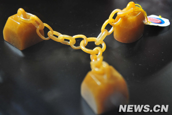 三連扣田黃印壹組三枚。新華社駐臺記者 徐 然 攝