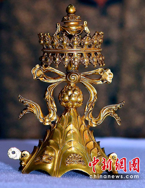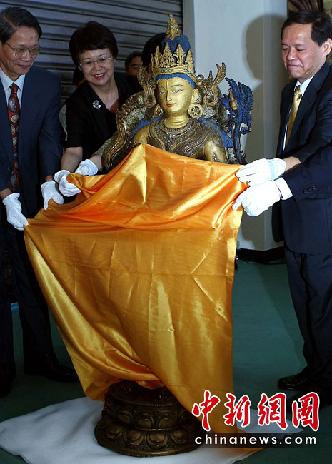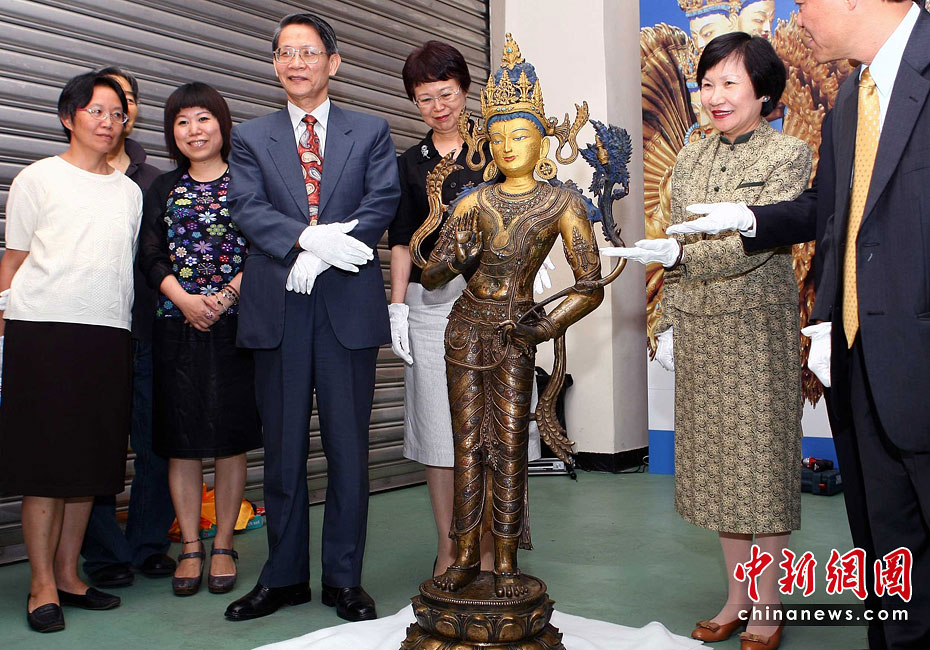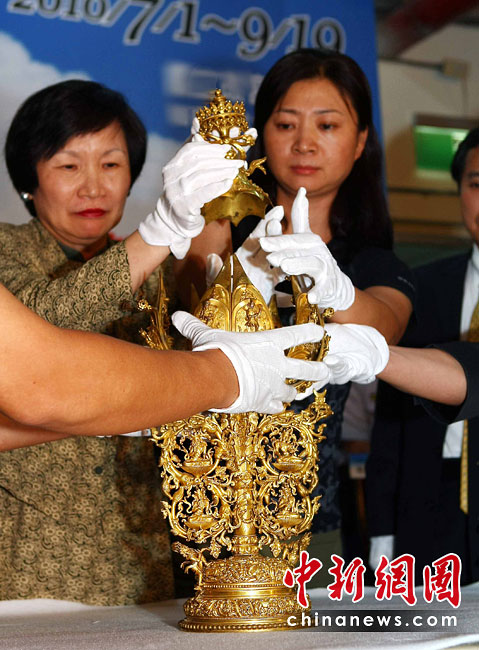 6月25日,工作人員將“鎏金銅彌勒菩薩像”、“金翅白海螺法號”、“八瓣蓮花曼荼鑼”等3件重量級文物開箱。7月1日,臺灣故宮博物院將舉辦“圣地西藏---最接近天空的寶藏”特展,展覽分“吐蕃王朝”、“金色寶藏”、“文化交流”、“雪域風情”四部分,共有130組件文物參展。中新社記者宋吉河 攝